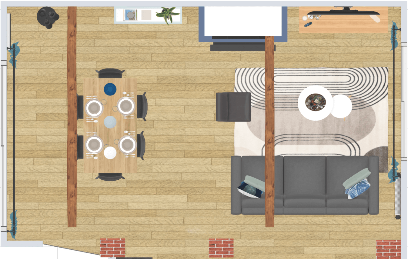 En effet, le salon et la salle à manger présentaient déjà des éléments de caractère : poutres, poteaux en briques, parquet et une cheminée dans les teintes bleu/gris.